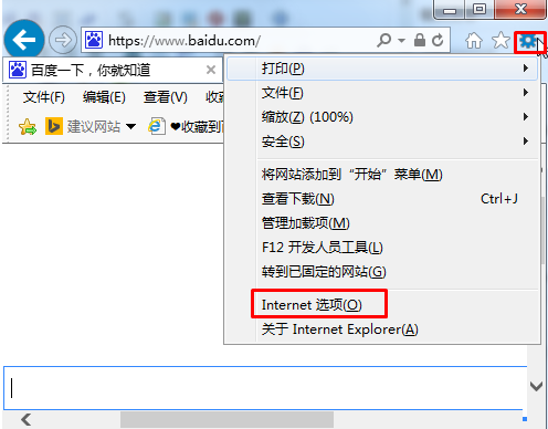 1、打开IE浏览器,然后点击“设置”——“internet选项”如下图: