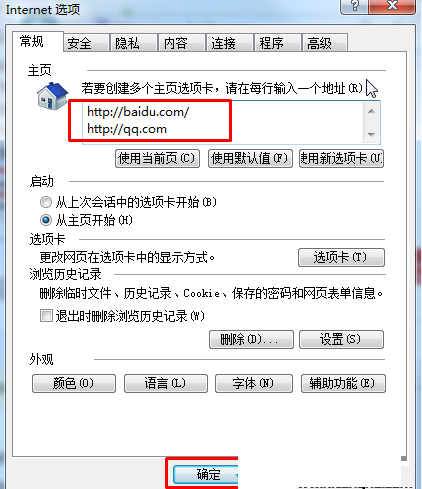 2、在打开的IE选项中,在主页输入框中,每一行输入一个网址(其实可以输入多个)然后确定;设置完成后,我们再打开IE就能弹出两个网页了。