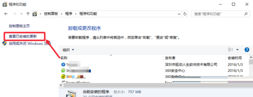 3、程序和功能窗口中,点击左侧这里的查看已安装的更新选项,如图所示。