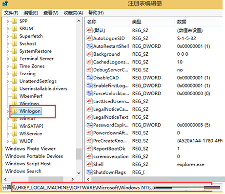 4、依次展开到以下子项:HKEY_LOCAL_MACHINE\SOFTWARE\Microsoft\Windows NT\CurrentVersion\Winlogon