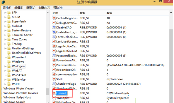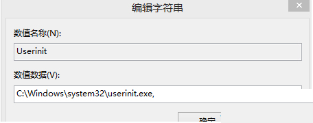 6、将Userinit的数值数据USERINIT.EXE,EXPLORER.EXE修改为:Userinit = C:\WINDOWS\system32\userinit.exe。